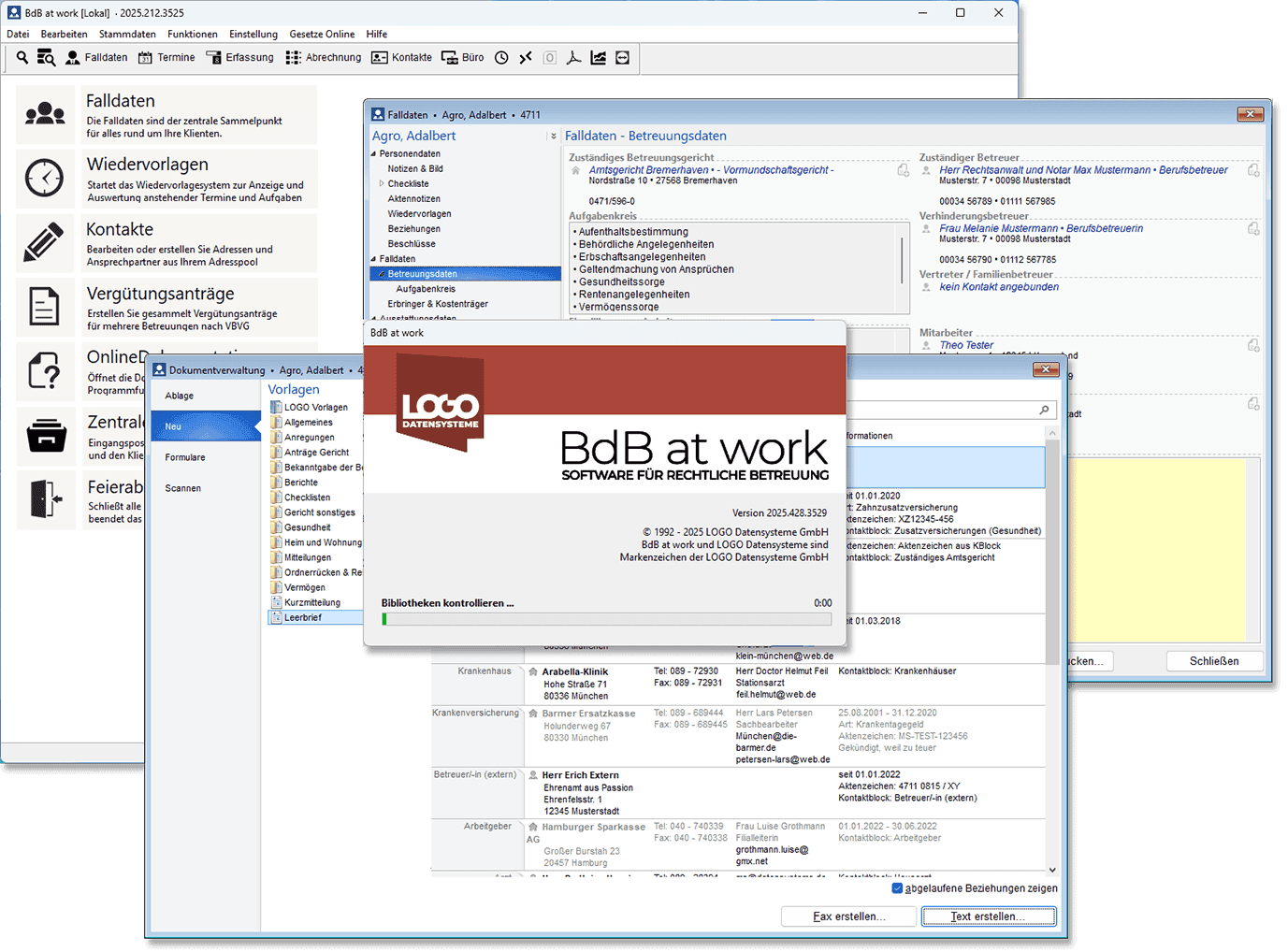 Mit BdB at work, der bundesweit von über 10.000 aktiven Kunden genutzten Software für rechtliche Betreuung ist LOGO Datensysteme Marktführer. Von der Erfassung, Verwaltung und Dokumentation umfassender Klientendaten über der Vermögensverwaltung und automatischen Rechnungslegung bis zur rechtskonformen Vergütungsabrechnung nicht nur für Berufsbetreuer nach VBVG, ehrenamtlichen Betreuer oder auch für Verfahrensbeistände und -pfleger reichen die umfangreichen Möglichkeiten von BdB at work.